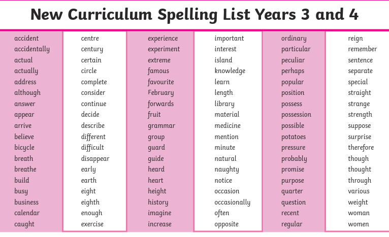 Please see below the list of year three four words that the children are expected to be able to spell with confidence and use correctly in their writing. Please help your child/children to learn these words and understand what they mean.