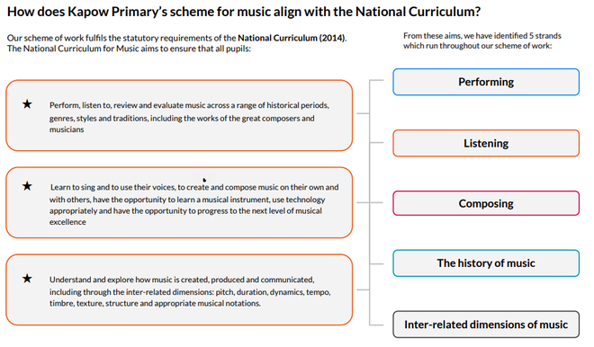 Kapow Primary's Music scheme takes an holistic approach to music, in which the individual strands below are woven together to create engaging and enriching learning experiences:
